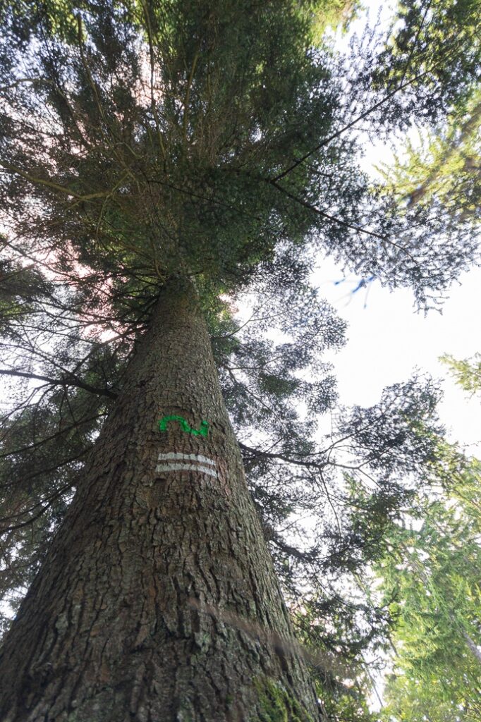 Zelená vlnovka označuje biotový strom, dvojitá bílá čára hranici lesního oddělení. Jedle nedaleko bývalého Malého Jindřichova.